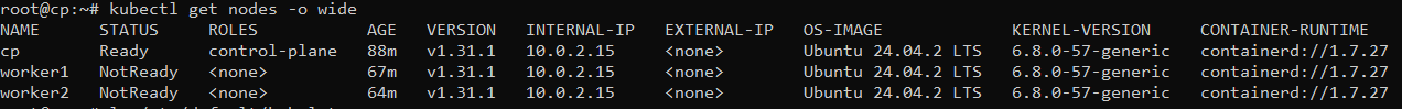 → One control plane pod will be stuck at 0/1 until a second node joins—Next Step!After both worker nodes have joined