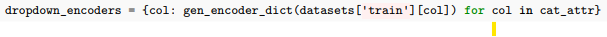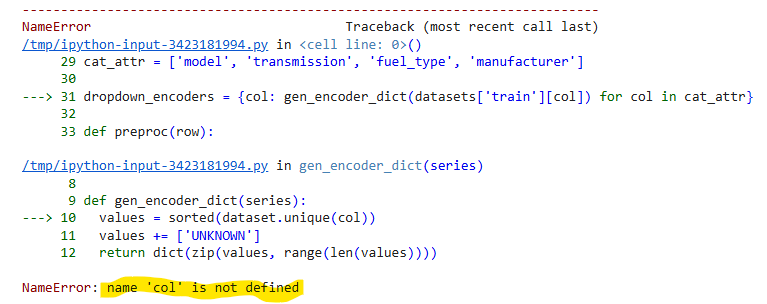 My understanding is that we will pass in one string from cat_attr and call the method for each. Each gen_encoder_dict(series) call is going to run the unique() func and expect col to have a value BUT there is no access to that variable. I did try a couple different things, but I am not 100% sure what the proper fix would be for this since it appears this way in the lab & lesson notes.