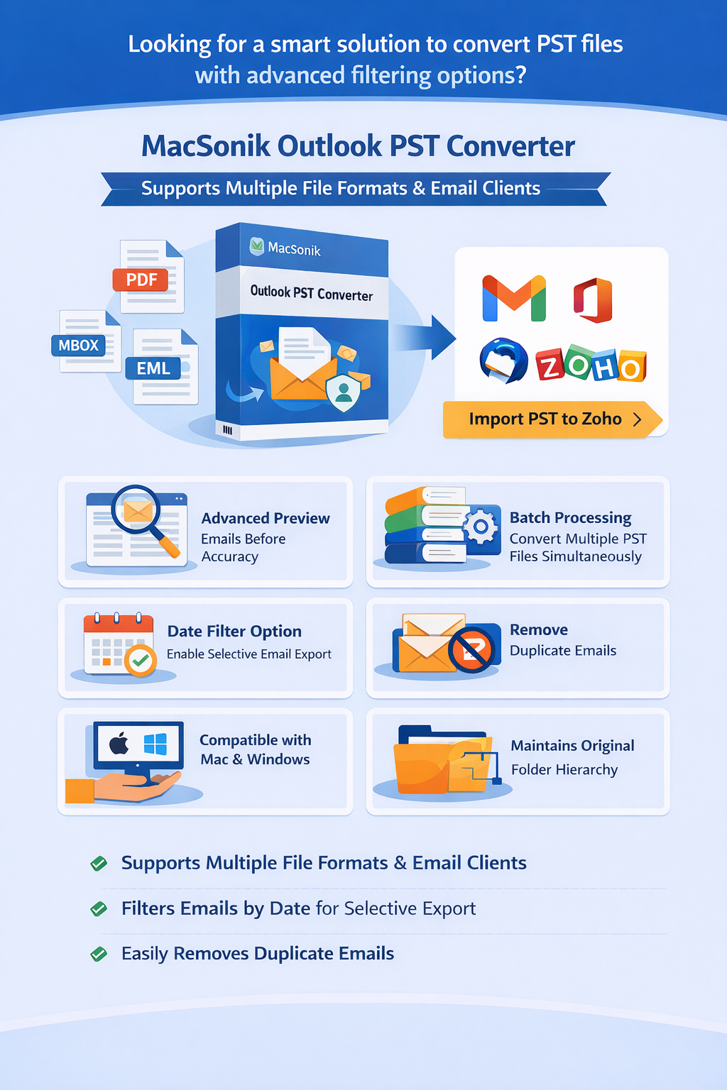 Looking for a smart solution to convert PST files with advanced filtering options? MacSonik Outlook PST Converter supports multiple file formats and email clients, and allows users to import PST to Zoho with ease. The software preserves email structure and attachments throughout the conversion process. It provides a preview feature for better accuracy before conversion. With batch processing, users can convert multiple PST files simultaneously. The date filter option enables selective email export. It also removes duplicate emails and maintains the original folder hierarchy. The tool is compatible with all systems and ensures smooth and efficient performance.