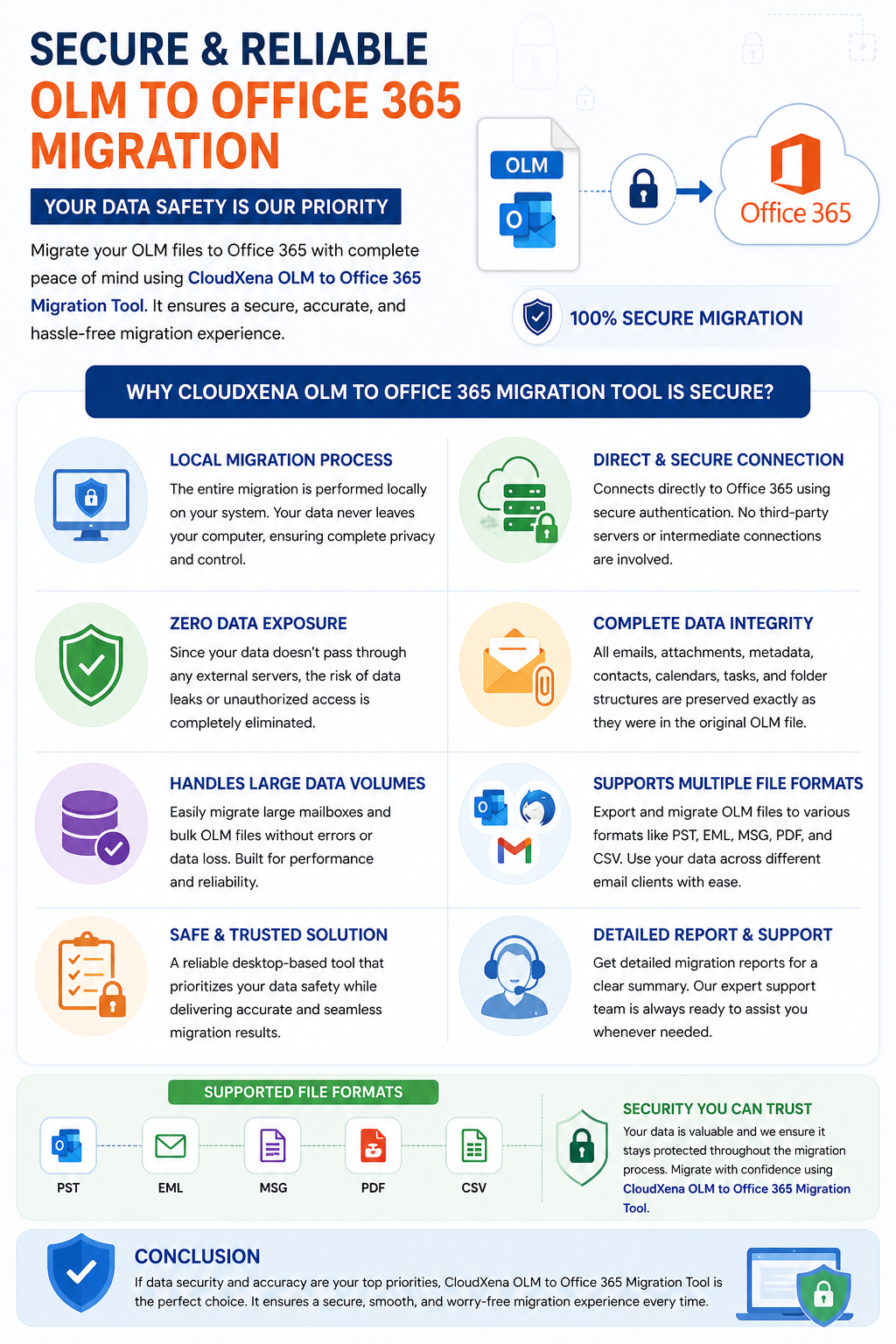 Security was my biggest concern when I decided to migrate my OLM files, especially because email data usually contains sensitive information. When moving data between different email clients, there is always a risk of data leaks or corruption if you rely on random online tools or unsupported methods. I initially tried converting OLM files into different file formats, but I wasn’t confident about the safety of my data. That’s when I started using the CloudXena OLM to Office 365 Migration Tool, and it completely changed my experience. The tool performs the entire migration process locally on your system and connects directly to Office 365 using secure authentication. This means your data does not pass through any third-party servers, which significantly reduces the risk of data exposure. It also ensures complete data integrity during migration. All emails, attachments, metadata, and folder structures are preserved exactly as they were in the original OLM file. Another great feature is its ability to handle large data volumes without errors, which is often a problem with manual methods or basic tools. The software supports multiple file formats like PST, EML, MSG, PDF, and CSV, so if you need to use your data across different email clients, you can do that easily without compromising security. Overall, if you’re worried about data safety, the OLM to Office 365 Migration Tool is a reliable option that ensures secure and smooth migration.