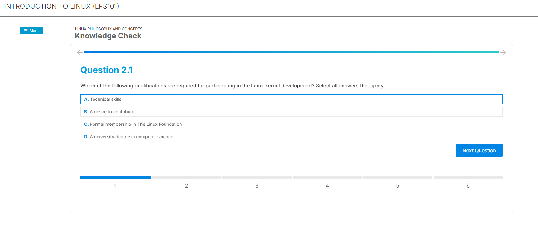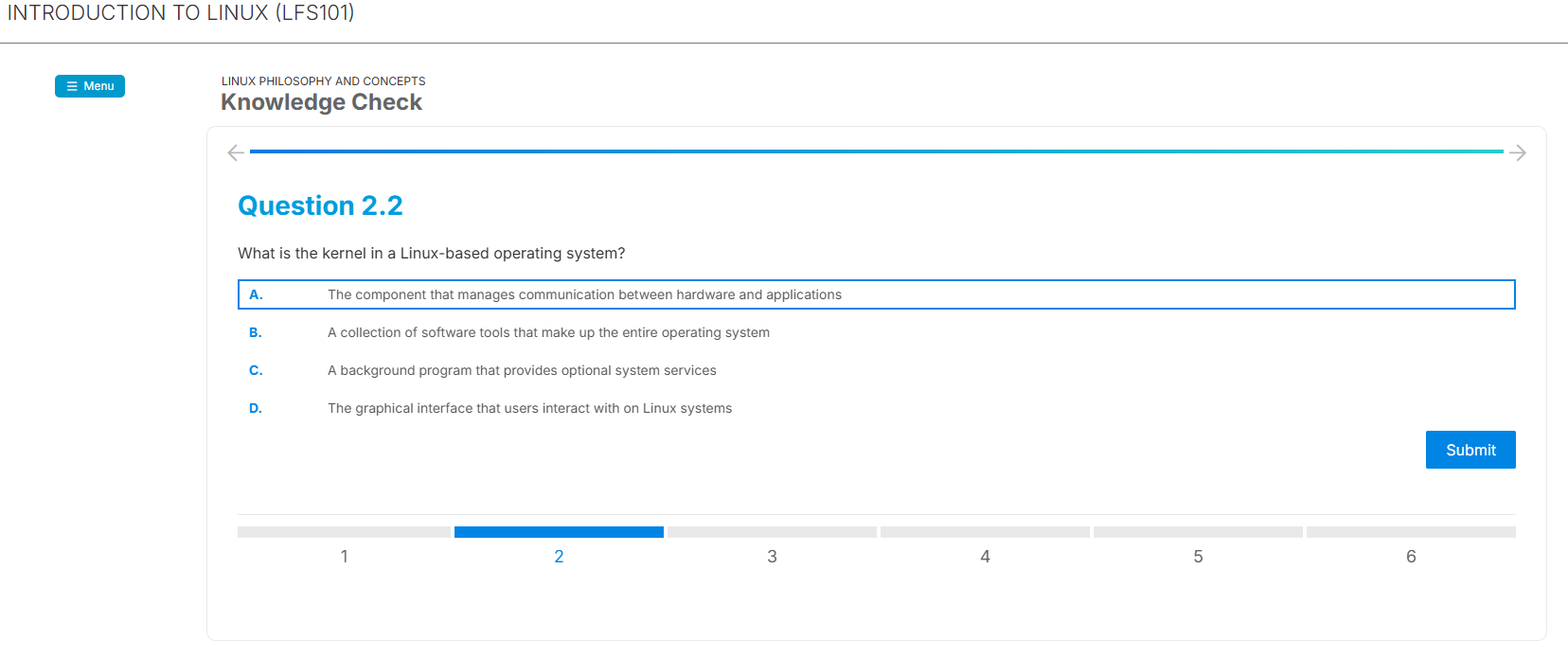 https://trainingportal.linuxfoundation.org/learn/course/introduction-to-linux-lfs101/linux-philosophy-and-concepts/knowledge-check?page=1
